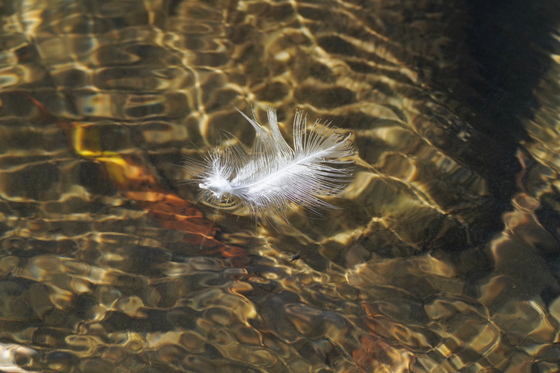 An all natural masterpiece done by the Master. Moving light waves smoothly suggest the invisible clear water. Standing out in the middle is a bright white delicate feather and a red twisted drown leaf, both having lost contact with the mother ship. A black patch opening at the top right corner exit the eye into the unknown.