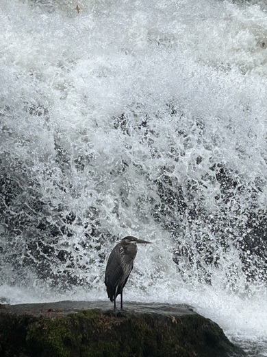 I took a picture of a blue heron waiting for salmon in front of a waterfall in Nanaimo.