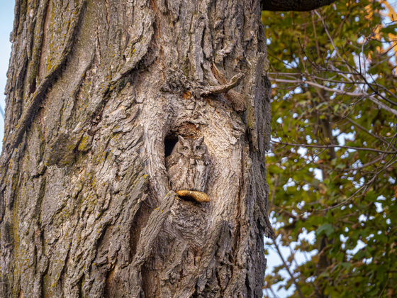 A local Eastern Screech Owl takes in some afternoon sunlight from its mushroom cap porch. The growing fungi makes for a perfect little perch at the edge of this Screech's cavity. It is often seen sitting out on it watching the nearby comings and goings in the park.