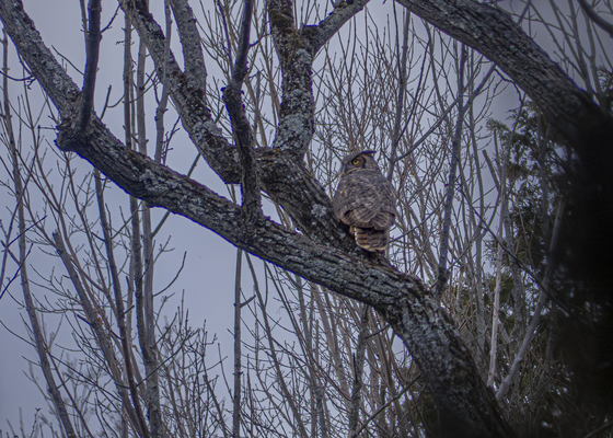 Walking on one of our local trails as the late afternoon sun began to set, I heard a distinct owl call. Pausing, to my surprise it had been coming from one of the big cedars from above. To my delight, the Great Horned few out and perched quickly on another tree, allowing me to capture it's profile as the sun set. It then flew down river to begin it's evening hunt.