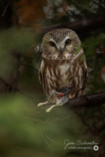 Shot at sunset on a rainy day, this little thing was tucked away in a cedar tree patiently holding it's evening snack.