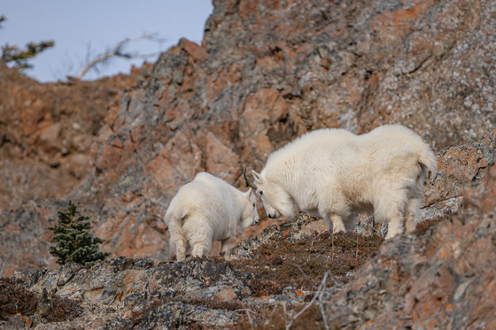 Above the south Klondike Highway a band of Mountain Goats makes this cliff their home. It took a steep climb to get a good look at the animals. I used a long zoom lens in order to get a good shot but also to be at a great distance not to disturb the animals.