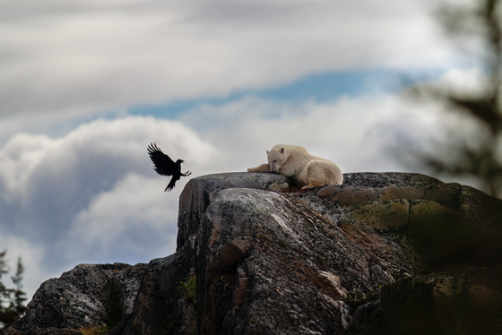 I was out on the Arctic tundra during a summer expedition in northern Manitoba when I came across this male polar bear. He wandered past my vehicle, climbed to the highest point along the rugged coastline, and lay down. Out of nowhere, a Common Raven started pestering him. It flew right up to his face, pecking at him, and he only swatted at it once. It was a reminder about staying calm in the middle of everything happening around us, and everything happening to our planet. The bear understood exactly how much energy he would waste if he focused on this one annoying little bird. That quiet wisdom taught me something valuable that day.