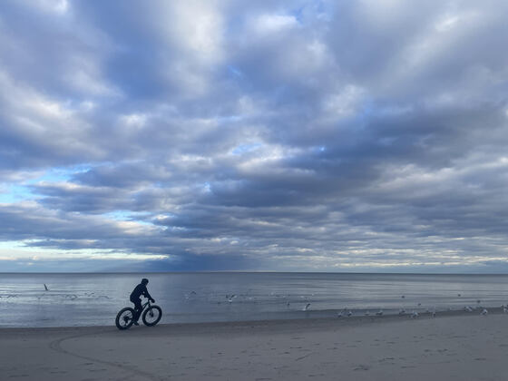 Bike and rider changed the alchemy of shoreline and horizon for brief seconds.