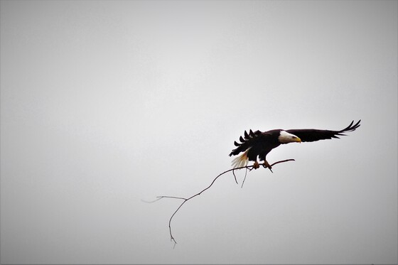Beautiful Bald Eagle bringing back the final branch for his nest.