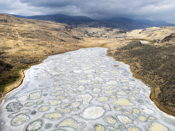 Taken with a DJI Mini 3 Pro drone, looking down the length of Spotted Lake to the incoming storm clouds. Near Osoyoos, B.C.