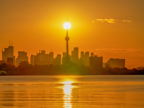 Magical sunrise with sun alignment behind CN Tower in Toronto. Moments like these are worth waking up early for.