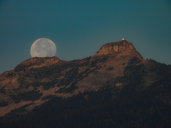 Months of waiting, met with uncooperative weather, trying month after month and getting up at ridiculous hours in order to time this one right, and I finally got my shot. A bright, nearly full moon setting on Saddle Mountain sits perfectly next to the old fire lookout, silhouetted against the rugged mountain profile, illuminated by the golden morning light coming up as the moon goes down. The two together co-create an interplay of light and color, where the sun's golden light illuminates the moon's fading presence against a canvas of a steely blue sky, creating a serene twilight atmosphere that bridges night and day.