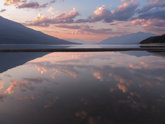 Upper Arrow Lake is regulated by the Keenleyside Dam, constructed by BC Hydro in the 1960s as part of the Columbia River Treaty with the United States. The lake's water levels fluctuate due to both natural and treaty-related factors. By late summer, sandbars are revealed, creating odd-looking landscapes and making for interesting photo opportunities. Coupled with changing weather and pink clouds, this rugged mountainous part of the Kootenays produces surreal and breathtaking beauty.