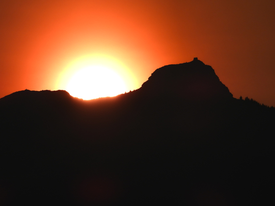 Smoke from nearby fires painted the sky with vibrant orange hues. The sun, glowing brightly like a fireball, dipped below the jagged silhouette of majestic Saddle Mountain, part of the Monashee mountain range in B.C. At the top of the summit stands the old lookout tower once used for spotting fires, now inactive for decades. Soothing colors and the gentle, warm glow of the setting sun gave way to a peaceful end to the day.
