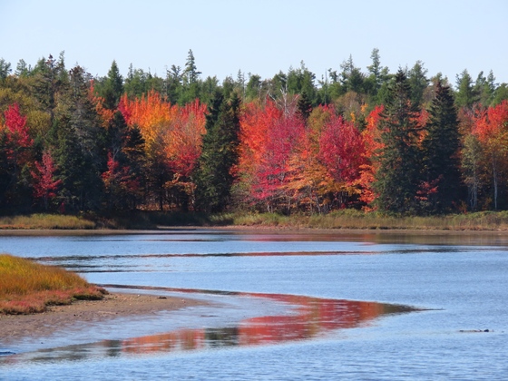 The Fall season dramatically changes the East coast scenery, with maple trees and their changing leaves in beautiful hues of orange and reds, reminiscent of apricots and saffron. In this photo, we can see the reflection of these vibrant colors in the water.