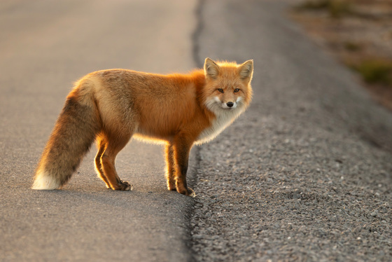 A beautiful vixen at the roadside edge as the sun creates a golden outline around her beautiful, full coat