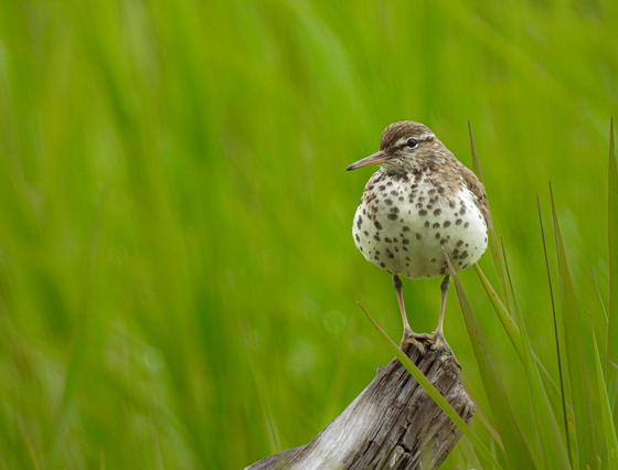 It's a peaceful morning walk along Upper Arrow Lake. The familiar call of a spotted sandpiper call out from a nearby field, still green and lush with spring growth. Scanning with my camera, I spot it perched and poised precariously on an old weathered stump. Its dark spots and white breast beautifully contrast against the vibrant field. The sky threatens rain and casts a beautiful muted light. I love overcast days; they are amazing for making colors pop. Standing unusually still, appearing demure, I captured this tiny, ever-alert bird in this vibrant scene, now one of my favorite shots.