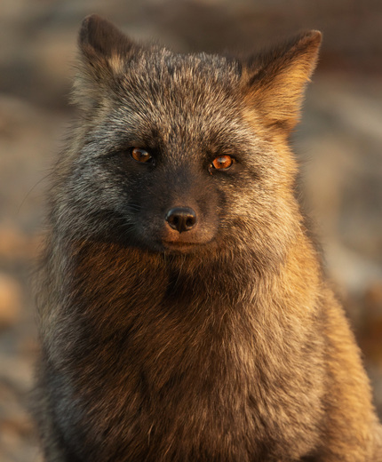 A cross fox sits quietly in the suns warmth as the light shines beautifully on this posing fox