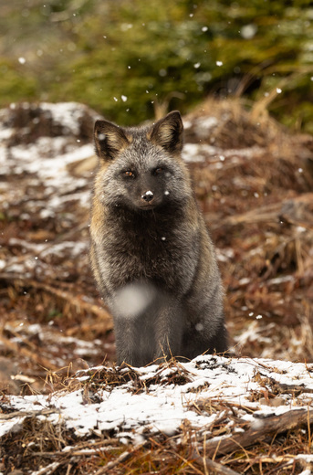 My first snowfall of the season in Port au Choix was a memorable experience, with the most captivating wildlife scenes. This cross fox sat pretty as huge fluffy snowflakes filled the air. He had just finished sniffing in the snow and had the cutest little patch of snow on his nose.