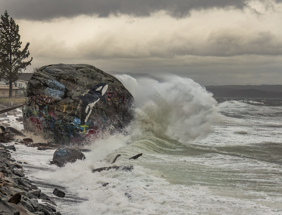 When the Southeasterly hits the East side of Vancouver Island, we batten down the hatches and enjoy the wind and waves. This is Big Rock in Campbell River as it is getting pounded by a winter storm.