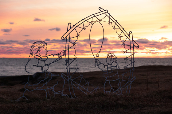 A sculpture located at Port au Choix National Historic Site. Mother and son preparing a sealskin as vibrant colors fill the sky with the setting sun in the background. Calm before the storm