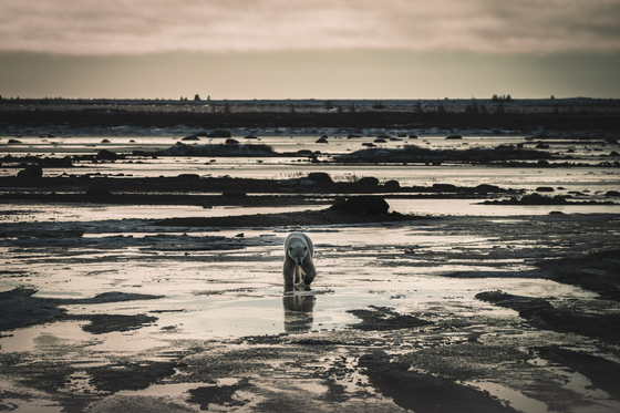 This is an image of a polar bear roaming the coastlines at the last light waiting for the sea ice to freeze.