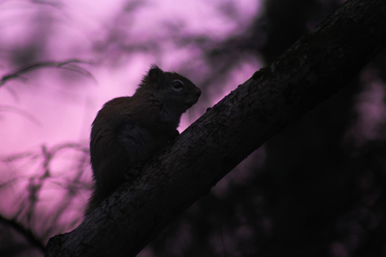 Ce soir-là, l’affût a été vide. Pas même un oiseau pour rompre le silence. Juste moi et le vent. Et en repartant, j’ai aperçu une petite silhouette perchée sur une branche. Il a poussé son cri si distinctif. Ses poils étaient traversés par une lumière mauve, Une lumière presque irréelle. Il ne bougeait pas. Il observait le monde, comme s'il le comprenait mieux que moi. Alors j’ai fait comme lui. J’ai capté quelques images. Pas celles que j’étais venu chercher. Mais mieux : celles que je n’attendais pas.