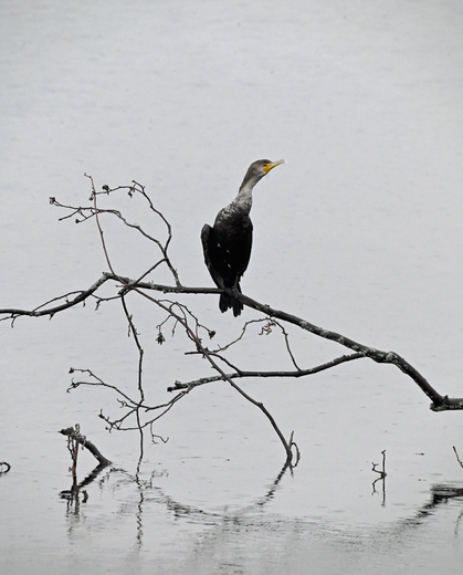Photographed this lonely cormorant sitting on a branch of a partially submerged tree, in the early morning fog.