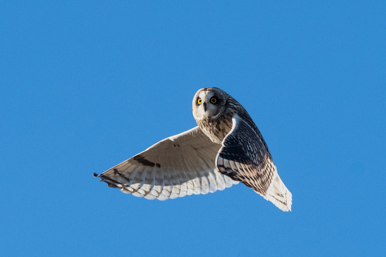 Each fall I look forward to the arrival of Short-eared Owls! I have an old golden colored coat that I wear for camouflage in the wheat colored fields. I stand or sit in the tall grass (I'm short so cannot see over the grass most times) and hide out waiting for owls. I am utterly amazed by their keen sense of sight! You know you have been spotted when their flight pattern stutters and they circle around you with great curiosity.