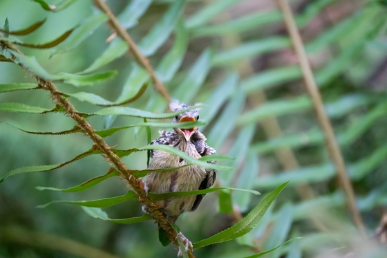 The hungry Yellow-rumped Audubon’s Warbler chick perches on a fern leaf in Stanley Park, Vancouver BC.