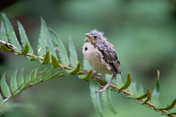 The Yellow-rumped Audubon’s Warbler chick perches on a fern leaf.