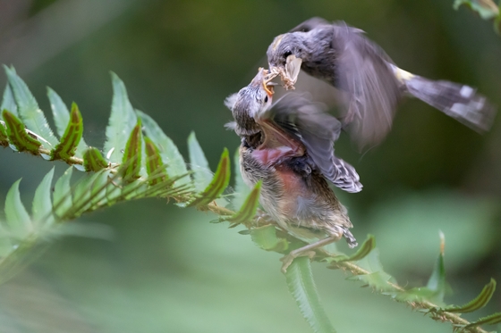 The Yellow-rumped Audubon’s Warbler chick is being fed by female.