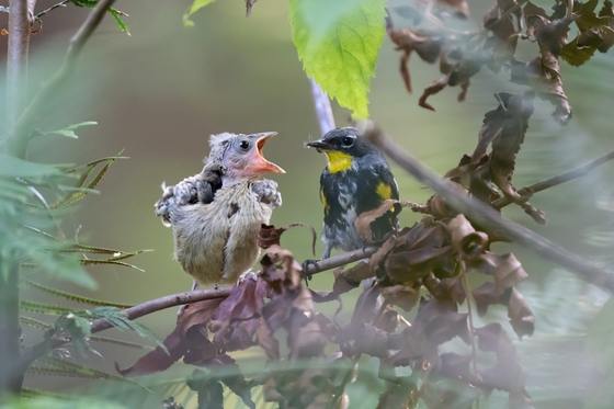 The Yellow-rumped Audubon’s Warbler chick is being fed by male.