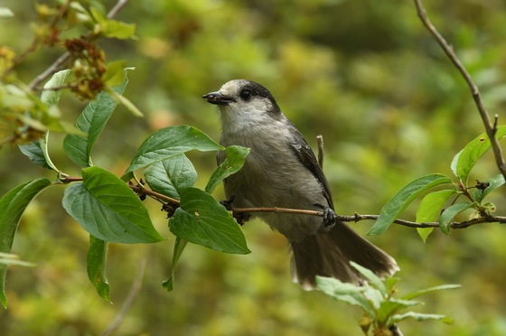 This beautiful Canada Jay landed on a bush close by and was eating berries and bugs.