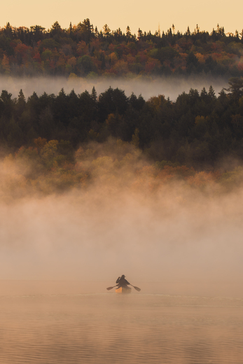 A middle of the night departure plan from my home in Thornhill - and a dark three hour drive - was needed in order to arrive in time for an autumn sunrise at Lake of Two Rivers. An effort for which my good friend and I were duly rewarded as we enjoyed watching a most beautiful, ethereal sunrise unfold as cool air mist clung to the lake water. A moment of magic happened as my telephoto lens found two canoeists paddling directly away from me, into the mist and towards the distant hidden shore, with layers of muted fall colours and fog dramatically rising in the background.