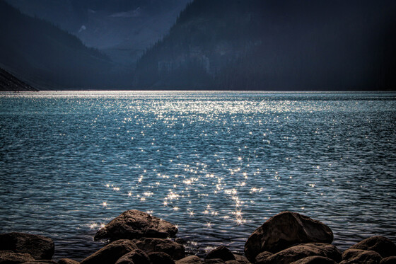 I caught the sunlight brilliantly glinting and sparkling on the surface of the water, creating numerous star-like reflections. Lake Louise never disappoints!