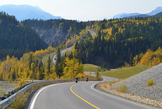 Fall colours , the Foothills and the Rocky Mountains provide a thrilling view while riding motorcycles after a hike during the final days of Autumn.