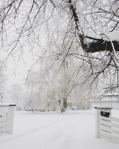 A stunning Willow tree on a heritage farm, covered in fresh fallen snow.