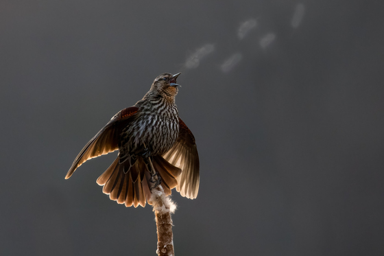 Female Red-winged Black Bird singing a song on a cool spring morning as it hangs on to a swaying bullrush.