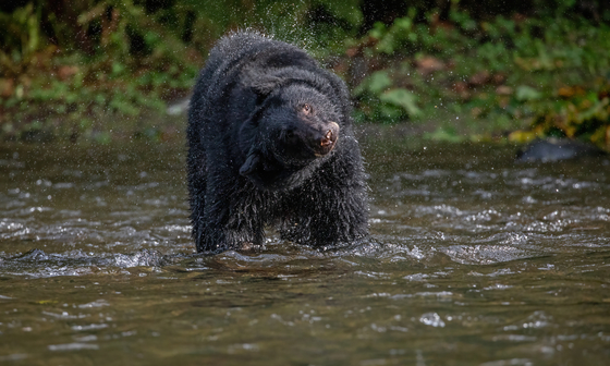 A black bear has been hunting salmon in the river and has a good shake to dry herself off