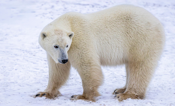 This large polar bear stands in the snowy, Churchill landscape and I am beyond thrilled to witness this event. The bear has thick, creamy-white fur and dark eyes and nose. Its large paws are visible on the snow-covered ground. All is quiet!