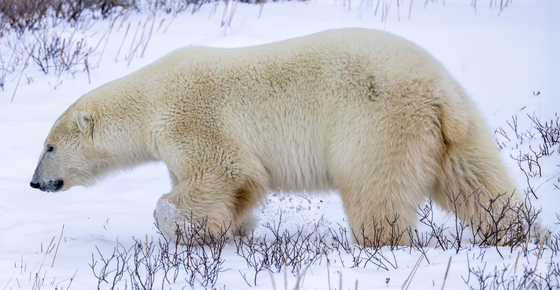 I captured this polar bear in mid stride, navigating the snow covered landscape with sparce vegetation and I am amazed at how the bear's creamy white coat provides excellent camouflage in this Arctic environment! My dream trip!