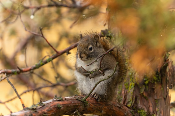 I have this squirrel that frequents our place, constantly running across the railing on our porch and jumping in between the two trees off the porch. One rainy morning, I saw the squirrel keeping dry under the branches of the juniper tree. It was too cute not to photograph.