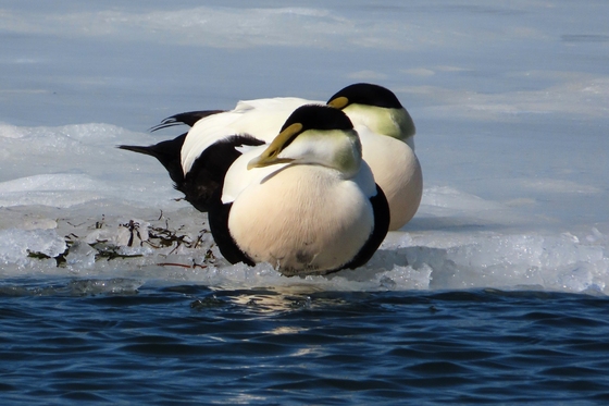 As I was taking this photo of an Eider sea-duck on the ice on a very cold winter day in Caissie Cape, New Brunswick, I noticed a second one behind it! They are perfectly aligned, both heads turned in the same direction (even as they both turned their heads later). These large sea-ducks come here along the Northumberland coast for the winter.