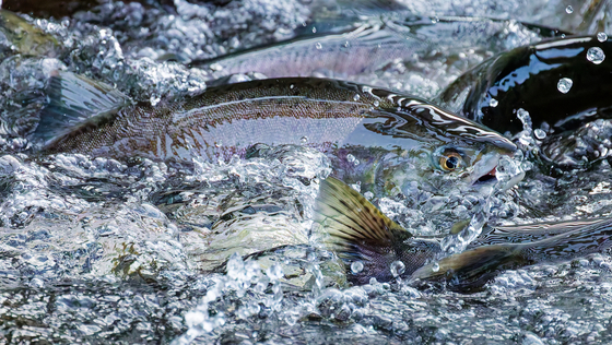 Each year salmon return to the rivers where they started their lives to spawn. The pink salmon in the photo occasionally build up in numbers in one location to a point where they surface frequently