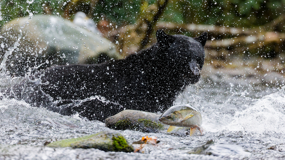 Many black bears on Vancouver Island spend considerable time fishing on rivers when the salmon are migrating. Bears are not always successful catching a salmon as shown in the photo