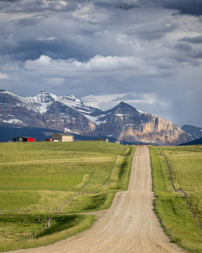 I was on my way to Waterton Lakes National Park when I spied the long road heading to the mountains with the red building and a wonderful backdrop of clouds with the sun peaking through in areas and rain in others. I pulled over and dug out my camera to capture this