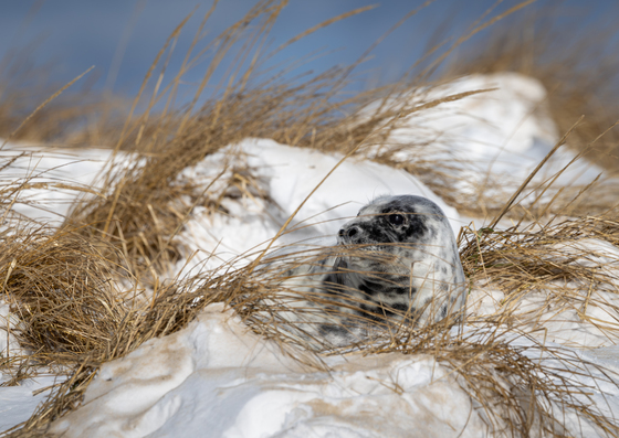 This grey seal pup was hidden amongst grass on a snow covered dune on Sable Island. It seemed that around every corner was a seal or seal pup. We had to be careful as to where we went as seals can be very aggressive when protecting their young.