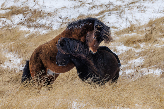 Shortly after we arrived on Sable Island we came across these two wild horses with the bay colored horse displaying dominance over the black horse. The dunes were snow covered and the horses had their winter coats on.