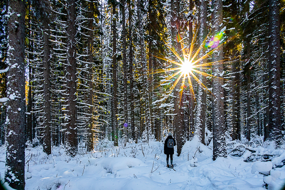 The sun peeks through a frozen forest backdrop on this snow shoe adventure.