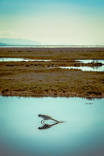 A Great Blue Heron stabs at a fish in the shallow ponds of Mud Bay
