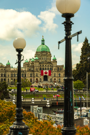 The BC parliament building flying the Canadian Flag Victoria Day weekend.