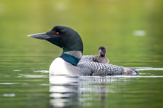 This mother loon (Gavia immer) floats by with a baby chick peering out from under a protective wing. I have watched this nesting sight for a long time. Her last successful hatch was seven years ago. Heavy rains in mid June here in Nova Scotia usually end in her nest getting submerged before the chick is hatched.