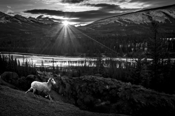 This picture is a culmination of many days in Jasper, Alberta this winter to capture wildlife returning to the fire ravaged town and surrounding area of Jasper. Before sunrise I hiked up onto a cliff to get a unique Bighorn sheep picture. This was the only morning that the sun showed it's beautiful rays to me but I was able to get the shot I had envisioned. The entire mountain in the background is a black, charred mass of burnt trees from top to bottom and just a slice of the magnitude of the fires that changed the landscape for this generation. Over 80,000 acres was burnt or around 325 square kilometers! This young sheep is a harbinger for future hope with the first Spring since the fires on the horizon.